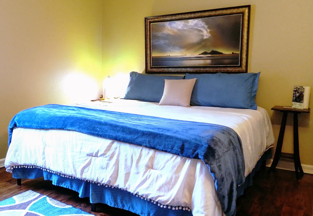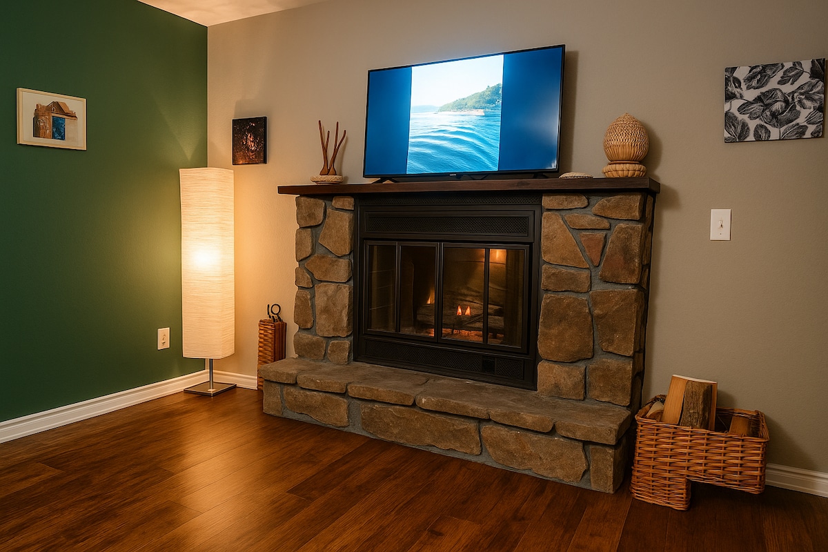 ​The Ultimate Cozy Factor: Unwind after a day of adventure on a plush memory foam king bed and enjoy the crackle of a real wood-burning fireplace.